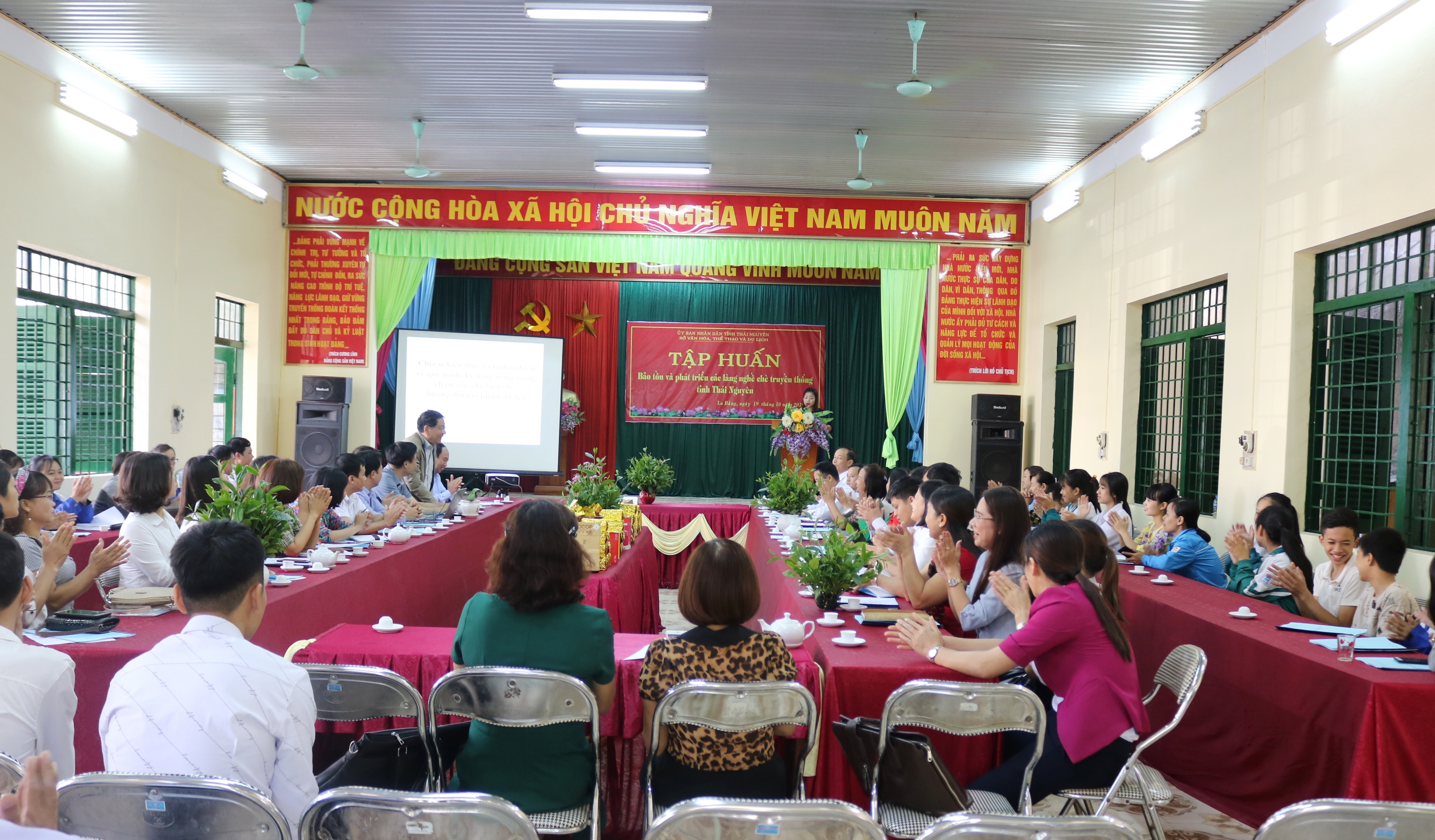 Để tiếp tục thực hiện các nội dung thuộc Đề án “Bảo tồn, phát triển văn hóa các dân tộc thiểu số trên địa bàn tỉnh Thái Nguyên đến năm 2020” theo quyết định của UBND tỉnh, ngày 19/10/2019, Sở Văn hóa, Thể thao và Du lịch đã phối hợp với Công ty cổ phần tư vấn Bảo tồn Di sản Toàn Cầu; các cơ quan, ban, ngành, các chuyên gia, nhà khoa học tổ chức chương trình tập huấn “Bảo tồn và phát triển các làng nghề chè truyền thống tỉnh Thái Nguyên” cho 120 học viên đến từ 05 huyện Đại Từ, Đồng Hỷ, Võ Nhai, Phú Lương và Định Hóa là địa bàn thuộc phạm vi triển khai thực hiện Đề án.Đặc biệt, Ban tổ chức mời lãnh đạo, giáo viên cùng các em học sinh các trường trung học phổ thông, trung học cơ sở trên địa bàn huyện Đại Từ tham dự tập huấn nhằm mục đích tạo môi trường trải nghiệm thực tế, giúp các em hiểu hơn về cây trồng thế mạnh của địa phương đồng thời khơi dậy tình yêu, niềm tự hào của thế hệ trẻ với nghề truyền thống của cha ông.