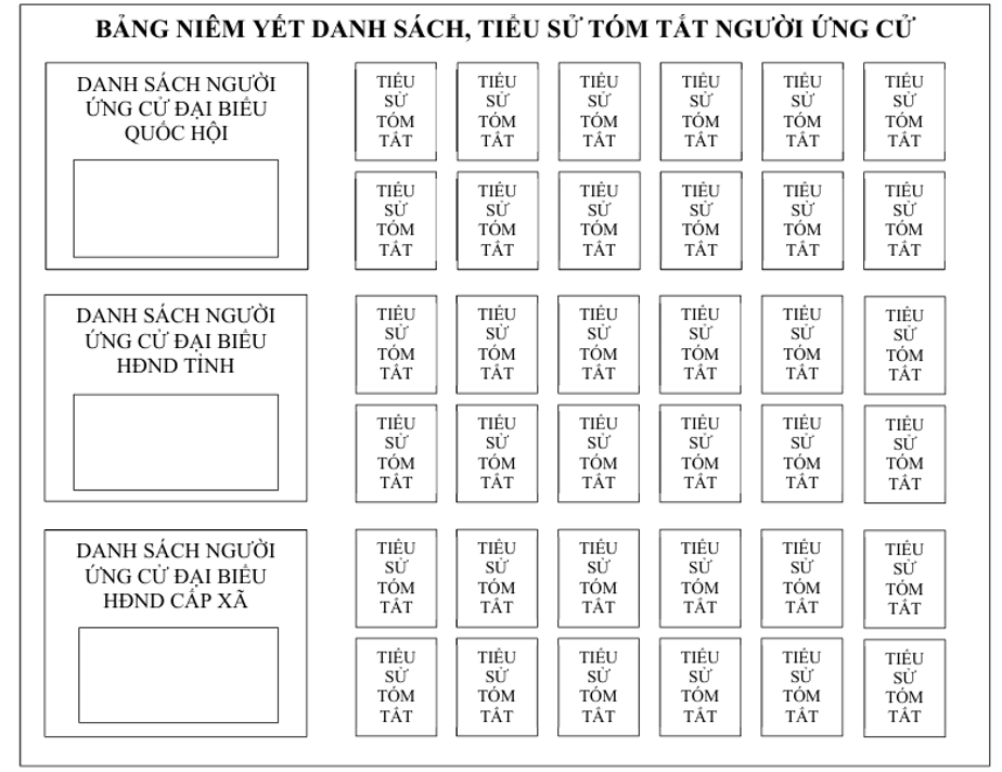 Niêm yết tiêu chuẩn đại biểu Quốc hội, tiêu chuẩn đại biểu HĐND, nội quy phòng bỏ phiếu, thể lệ bầu cử (nguyên tắc bỏ phiếu): Thời gian thực hiện trước ngày bầu cử từ 01 đến 02 ngày tại vị trí thuận lợi để cử tri dễ theo dõi, nghiên cứu. Việc niêm yết phải đảm bảo trang nghiêm, khoa học, dễ theo dõi, dễ nghiên cứu, ví dụ: Danh sách, tiểu sử tóm tắt những người ứng cử được niêm yết theo từng cấp và theo thứ tự của Quốc hội trước, sau đó đến HĐND tỉnh, HĐND cấp xã, ngay bên cạnh danh sách là tiểu sử tóm tắt. Có thể sử dụng bảng niêm yết để 5 dán các danh sách, tiểu sử tóm tắt (theo hình dưới đây); trường hợp không có bảng niêm yết thì in dòng chữ “Nơi niêm yết danh sách...” để dán ở phía trên vị trí niêm yết.